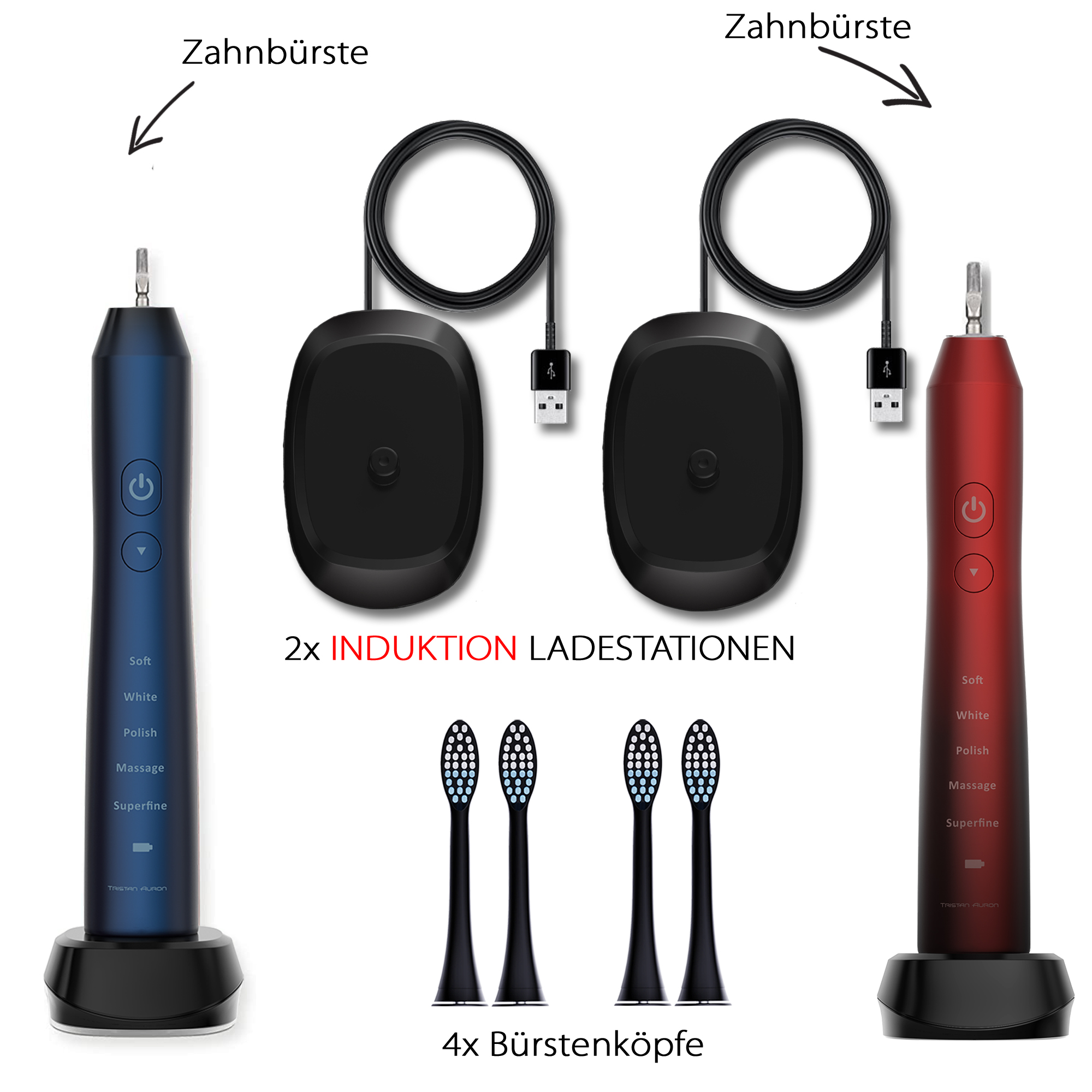 Tristan Auron Schallzahnbürste Business Class Doppelpack mit 4 Aufsätze Business Class (rot/blau)
