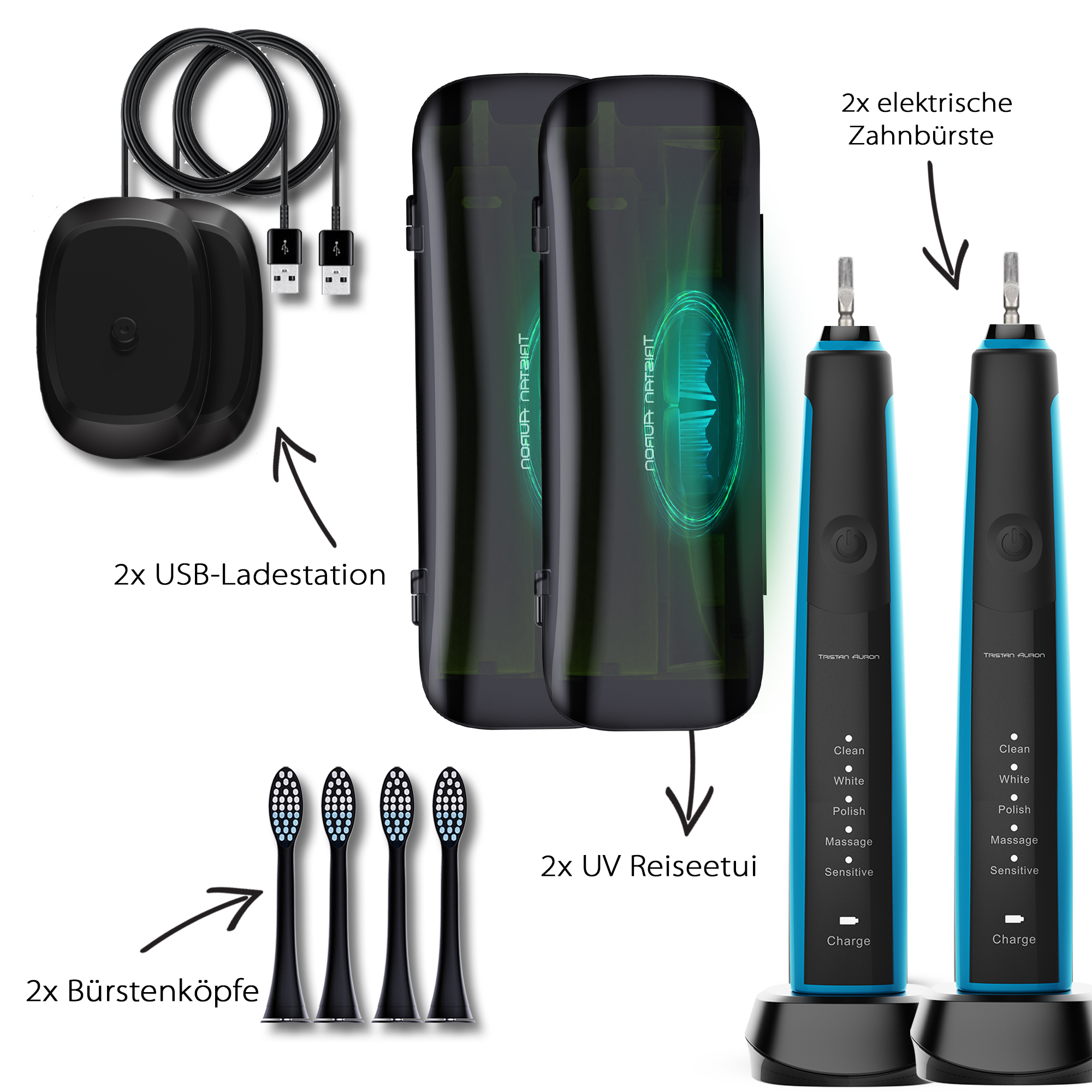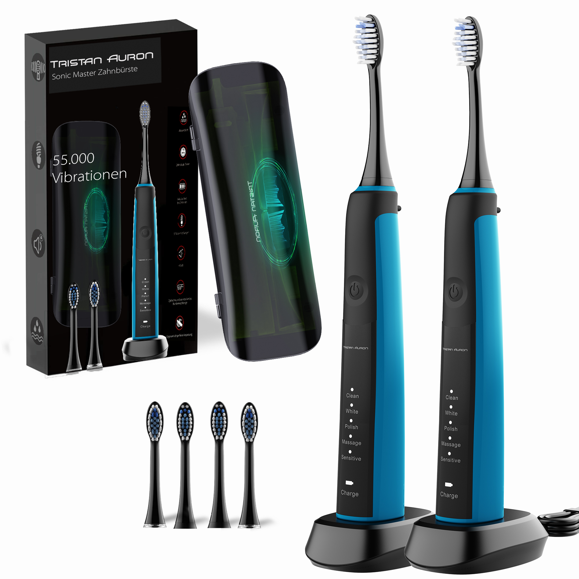 Tristan Auron Schallzahnbürste Sonicmaster Doppelpack mit UV Reiseetui und 4 Bürstenköpfe Sonic Master (blau)