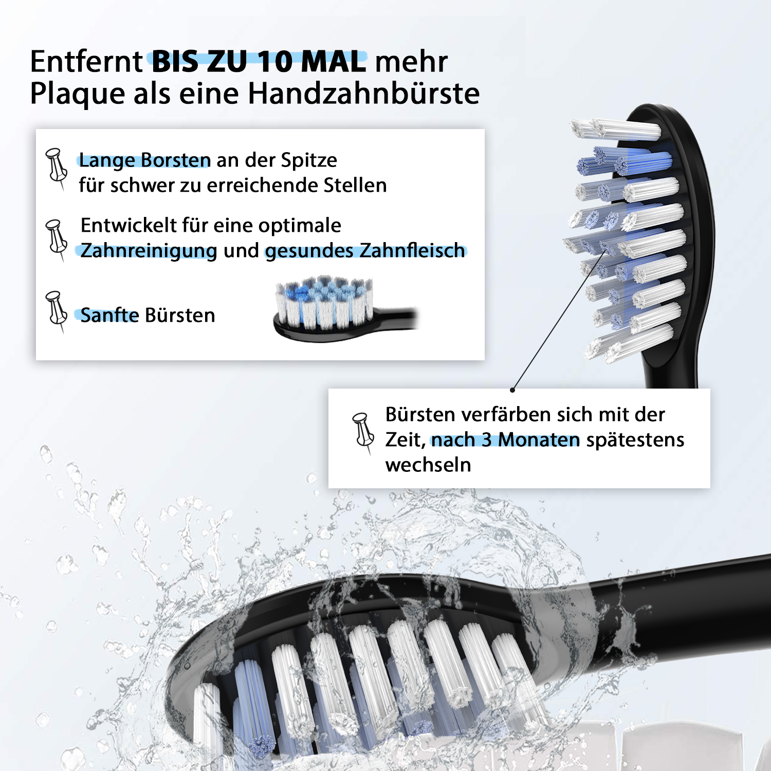 Es wird empfohlen, die Bürstenköpfe alle 3 Monate auszutauschen oder wenn die Borsten abgenutzt sind. Dies gewährleistet eine effektive Reinigung.