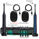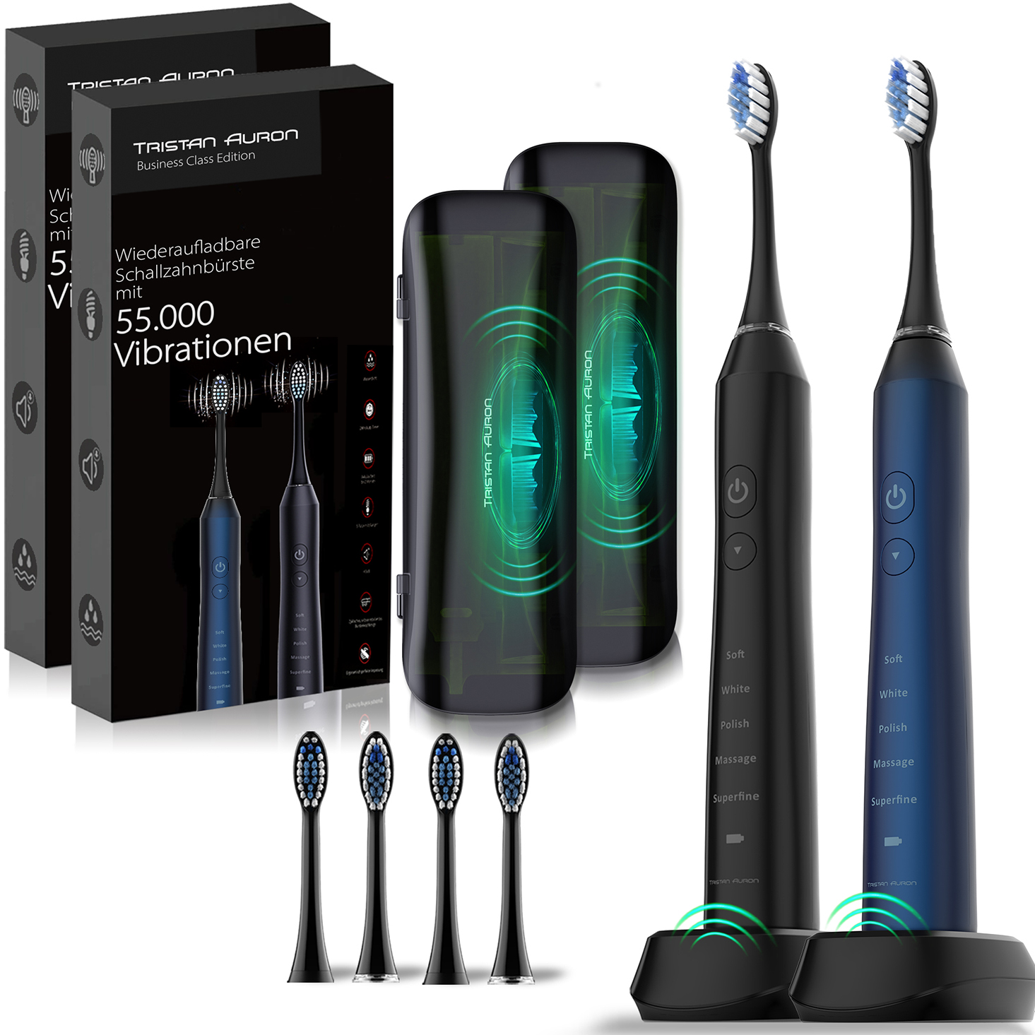 Tristan Auron Schallzahnbürste Business Class Doppelpack mit UV Reiseetui und 4 Bürstenköpfe (blau/schwarz)