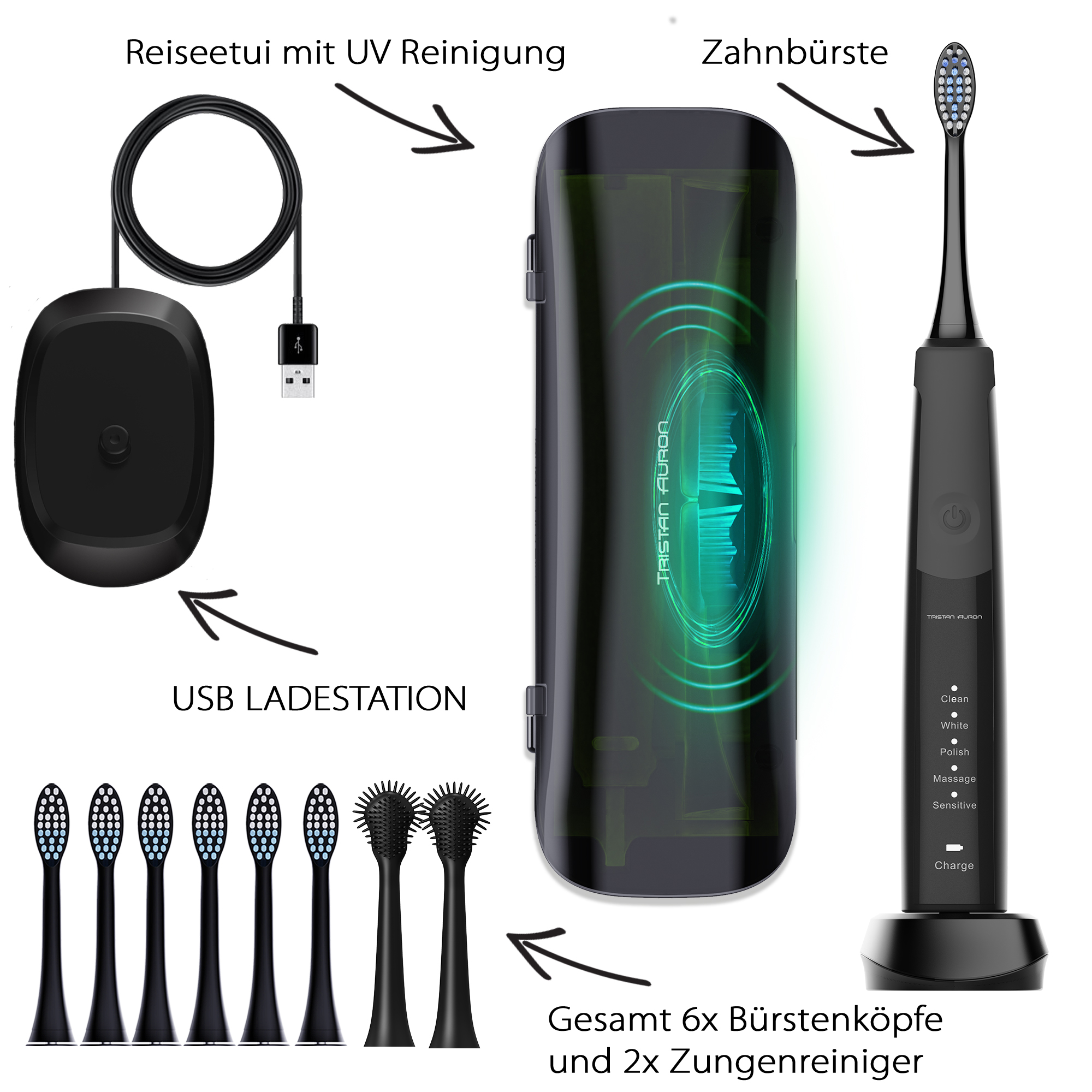 Tristan Auron Schallzahnbürste Sonicmaster mit UV Reiseetui + 6 Bürstenköpfe + 2 Zungenreiniger (schwarz)