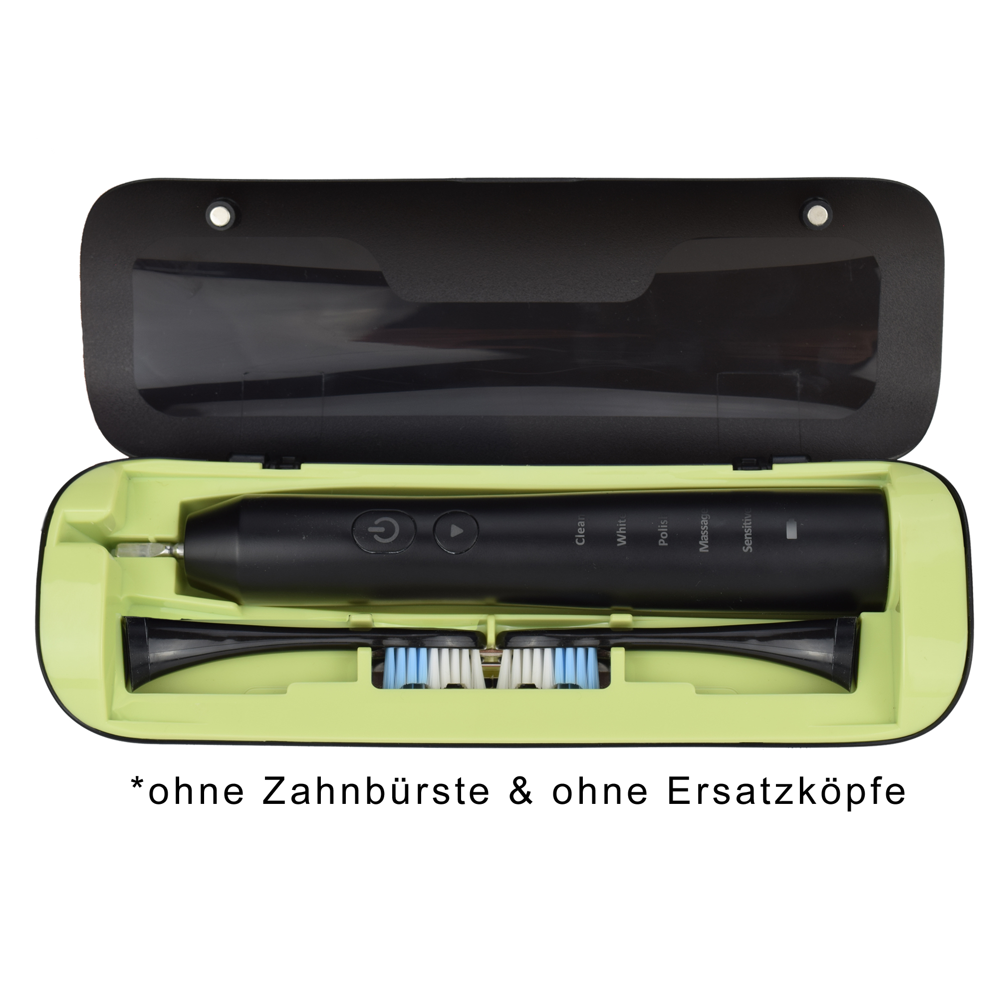 Reisetasche hat Platz für eine Zahnbürste und zwei Zahnbürstenaufsätze